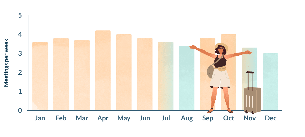 The data shows that “summer” - at least as far as people’s meeting habits, really means “August.” June was actually a busier meeting month than average, with July in the middle. December, as you might guess, had the fewest meetings of all due to the holidays.